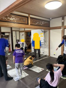 リーダーのスタッフを相手にじゃんけんを行い、負けたら乗っている新聞紙を半分に折りたたみます。