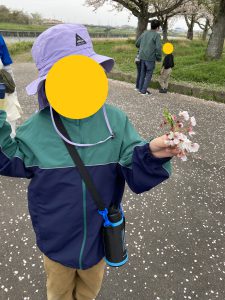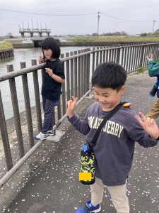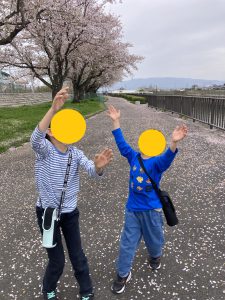 地上の桜の綺麗さはもちろんの事ながら、たくさんの花びらが川に落ちて水面に大きな絨毯のようにピンク色が広がっている様を見て、子供たちと春の深まりを感じました。