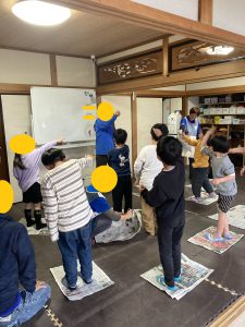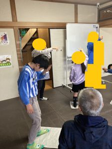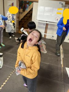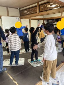 負けが重なると足を置ける面積が減るため、片足で揺れながらもじゃんけんに奮闘する子や新聞紙の折る向きを工夫することで、横長の島を作って両足立ちを続ける子など、各々の戦略や頑張りが見ていて非常に楽しかったです。