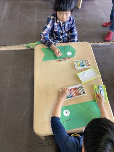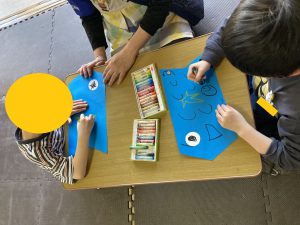 型紙に対して、子どもたちがクレヨンや色鉛筆を使って思い思いに描き込みました。