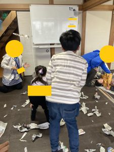 新聞じゃんけん終了後は、使った新聞紙をびりびりにして、新聞紙吹雪を吹かせてみんなと盛り上がりました!